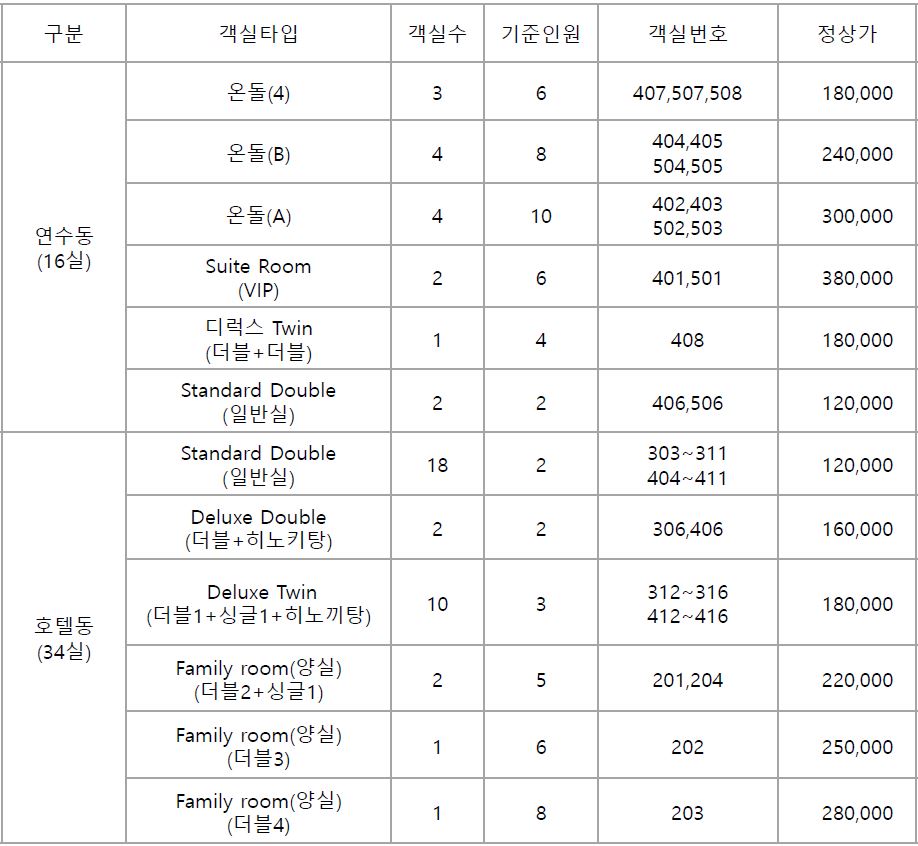 객실 요금은 위의 표를 참고 하시길 바랍니다.
